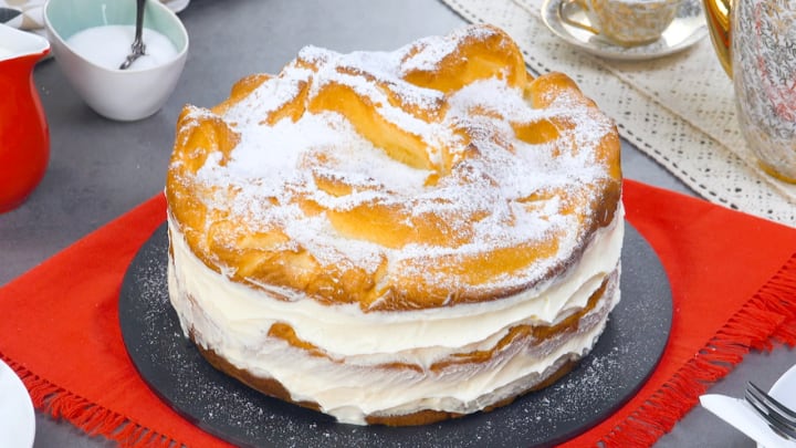 Karpatka is a popular Polish cream cake. The cake consists of two layers of pate a choux (a delicate pastry dough) and a thick layer of vanilla-flavored pastry cream. The cake is sprinkled with powdered sugar.