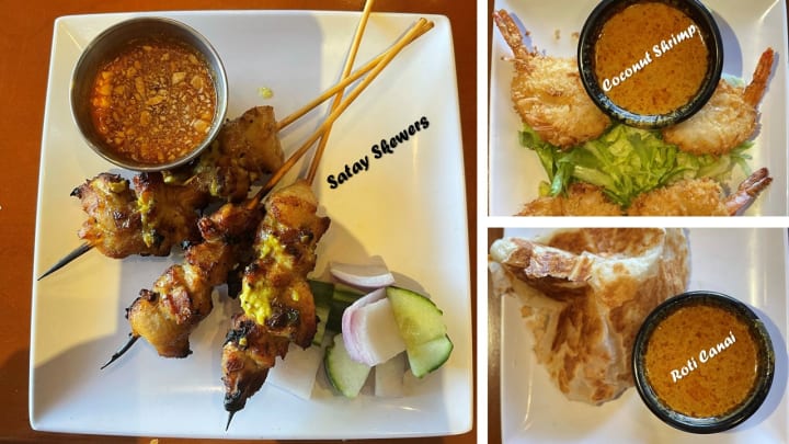 The menu consisted of tapas, grill options, wok options, specials, salads, noodle soups, and rice dishes. It is a bit complicated but each dish has an explanation of what it comprises. Our four-person party ordered Roti Canai, Coconut Shrimp, Satay Skewers, Malaysian Coconut Kari, and Mamak Nasi Goreng. Many of the items ordered were unfamiliar to us but we were willing to taste them.