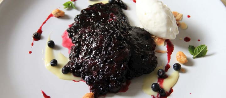 Moosbeermocken is a pancake-like dish made with fresh bilberries. These are wild berries found in the Alps. The dish is made with a light and fluffy batter that includes eggs, sugar, and flour. Then the batter is combined with fresh bilberries. The pancakes are fried until golden and served topped with icing sugar.