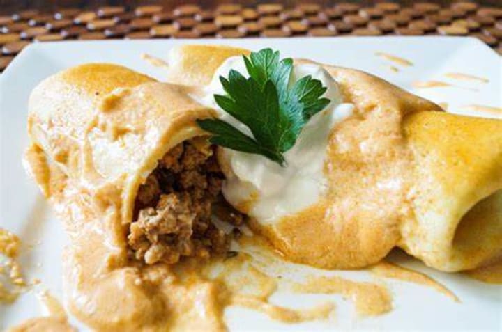 Hortobágyi palacsinta is a savory pancake specialty. The pancakes are prepared and filled with meat usually veal. The veal is prepared like a stew with sauteed tomatoes, onions, spices, and vegetables. Once filled the pancakes are baked in the oven.