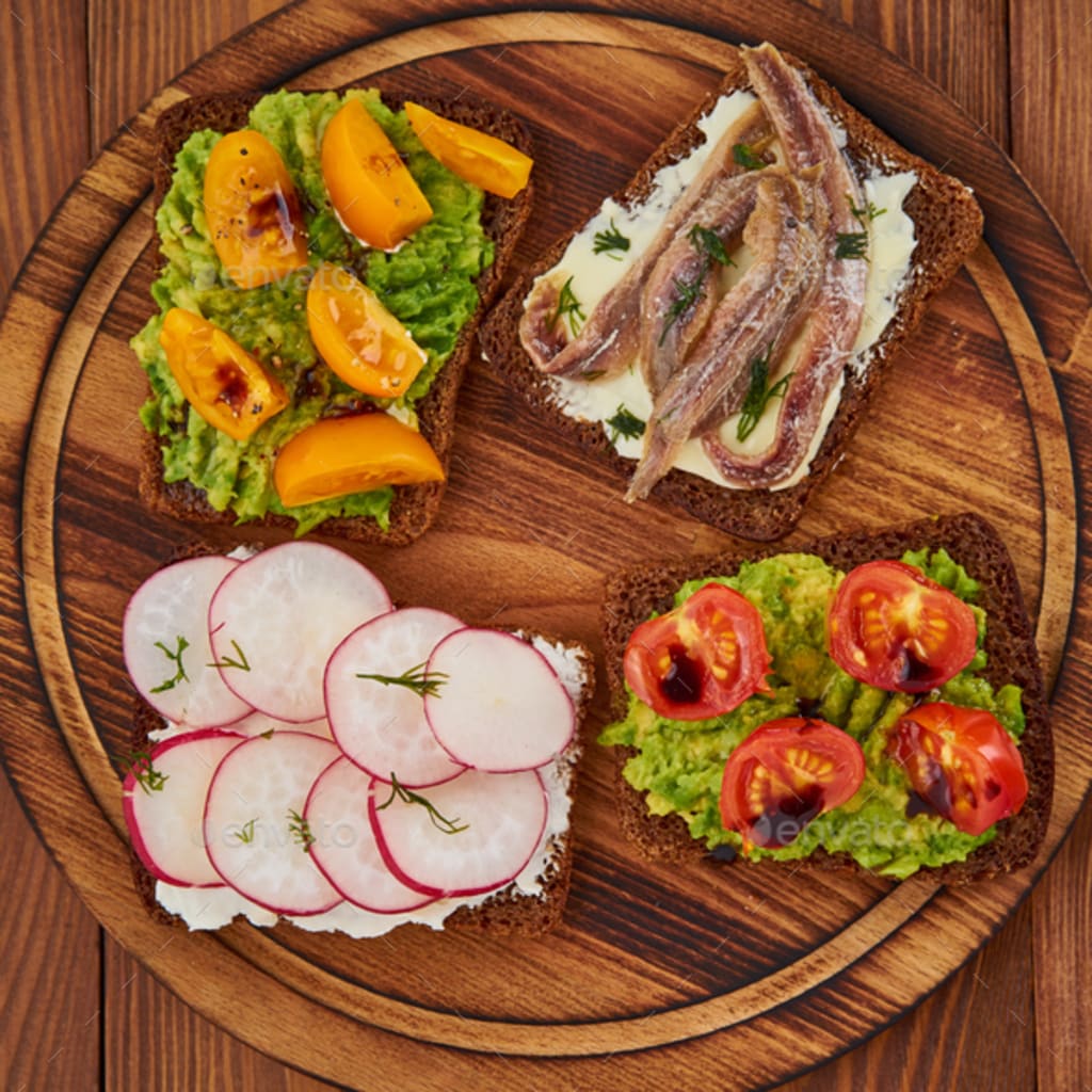 Smorrebrod are popular open-faced sandwiches. Buttered rye bread is topped with a variety of ingredients like cheese, fish, vegetables, and meats. Among the more traditional toppings are pickled herring, roast beef, prawn, or avocado.