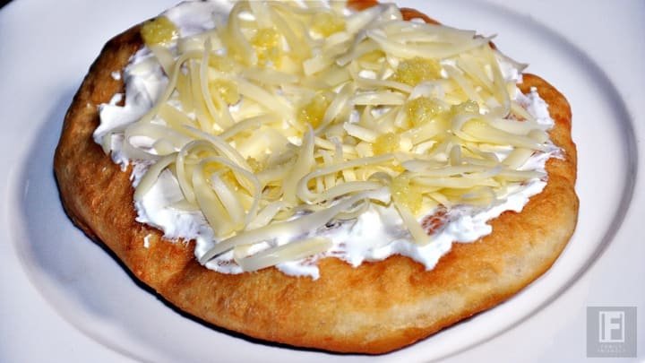 Langos is prepared by deep-frying dough made with water, flour, yeast, salt, and sugar until the dough is golden brown. The dough is then eaten plain or topped with grated cheese, or garlic sauce, or sour cream.