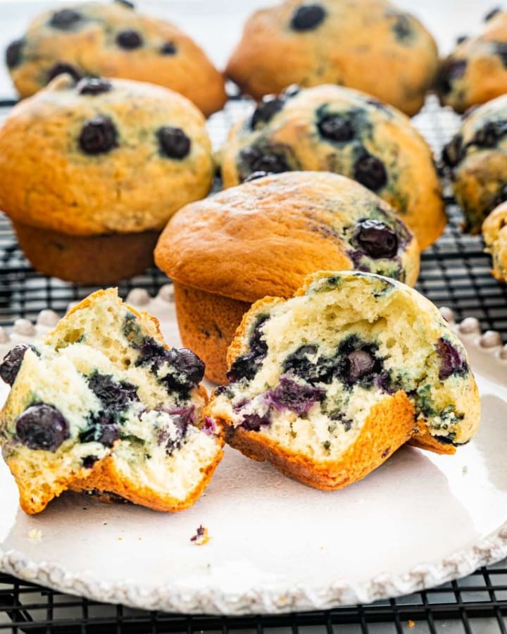 New Jersey Blueberry Muffins are prepared with a sweet and soft cake mixed in with succulent blueberries and baked in muffin tins.