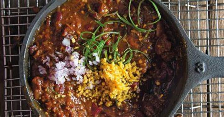 Even though Kansas City Missouri is known for its barbeque it also serves up great chili. Kansas City chili consists of ground chuck but can also be made with smoked pork shoulder. The beef is cooked slowly and simmered with onions, garlic, and spices like cumin and chili powder. Also included in the chili are fire-roasted tomatoes, smoked paprika, and a bit of barbeque sauce. For added sweetness, there are recipes that use brown sugar and molasses. It is served with cornbread or over rice.