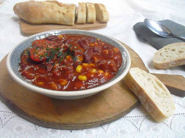 Wisconsin bratwurst chili replaces ground beef with sliced bratwurst that is cooked in beer. It is a combination of mixed beans like pinto, cannellini, or black beans, diced tomatoes, onions, garlic, and chili powder. Corn can also be included. Some cooks give it a unique twist by using sauerkraut.