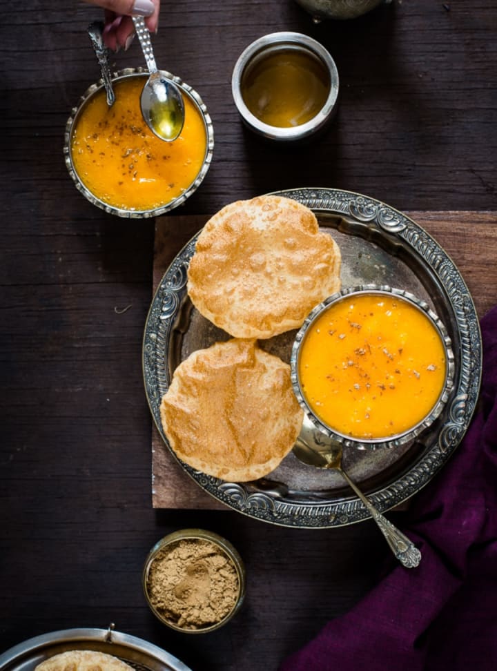 Restaurants get in on the madness too, with mango desserts in abundance on every menu. Mango milkshakes, sorbets, cakes, even in curries and Indian sweets, its truly mango madness everywhere. My most favourite thing though, is mango with cream, and yes its exactly what it sounds like; mango pieces with a whole bunch of whipped cream. SO GOOD. A variation on this is mango with vanilla ice cream, and that folks, is the entirety of my childhood summer memories in a cup. On Saturday nights, my father would drive us downtown to an old local restaurant to enjoy that simple but divine treat and it would make my whole weekend. A pulpier variety of mango is also pretty popular. This pulp, called aam ras (or the juice of mangoes) is often eaten with puris, a deep-fried disc of bread, a match made in heaven. This would be part of our Sunday lunches in summer, and we would often have friends over to join in in devouring as many puris as we could till we felt like we could never eat again. My cousins and I had our own mango tradition too; pour some ghee (clarified butter) over a bowl of the pulp, freeze till the ghee is solid and forms a nice crust on top, and then sprinkle some ginger powder. That might sound strange to anyone who has never tried it, but man, there are few things better than that on a hot summer night.