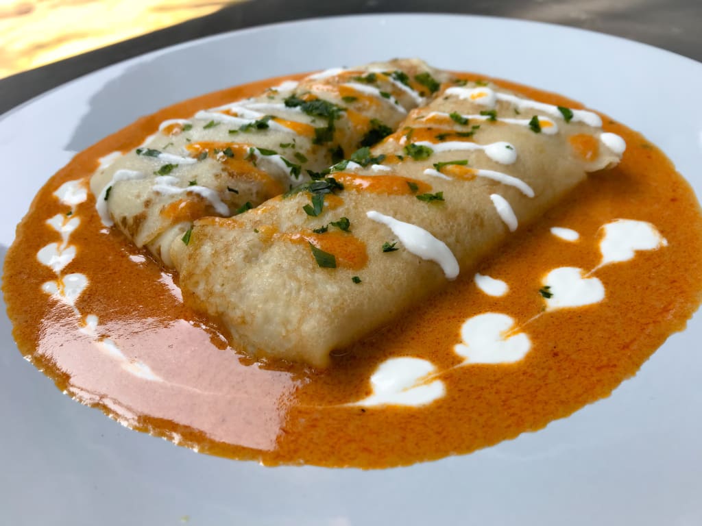 Entomatadas is a specialty prepared with filled tortillas in a rich tomato sauce. The sauce consists of tomatoes, onions, and garlic with spices and herbs like chili peppers and cloves. Corn tortillas are lightly fried and filled with shredded chicken, refried beans, and cheese topped with tomato sauce.