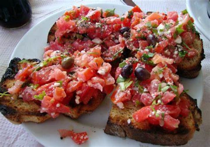 Dakos is a dish that originated in Crete. Paximadi a dry barley rusk is topped with crumbled myzithra cheese, chopped ripe tomatoes, whole olives, capers, fresh oregano, and a splash of olive oil. The rusk is rubbed with a piece of garlic and sprinkled with sea salt before topping.