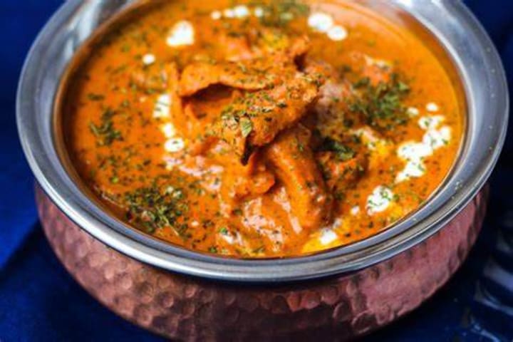 Murgh makhani or butter chicken is a dish that originated in Delhi. Tandoor-cooked chicken is stewed with tomatoes and butter.