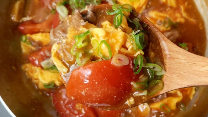 Fan qie chao dan is a traditional dish consisting of eggs and tomatoes. Among the ingredients used are oil, salt, sugar, and potato flour or cornstarch. The eggs are scrambled in large curds and stir-fried with sliced tomatoes. Other variations use ingredients like Shaoxing wine, garlic, ginger, or white pepper.