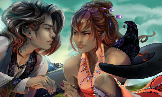 Fully invested in the crowded rhythm of the walk into the city, the group made it to a small square with tent-stalls at each corner. Startled from drinking in the sights, Jayed was pulled by Veygornne to the rightmost stall where sat a rotund lady being kissed and petted by—what was clearly suggested to be—her doting husband.