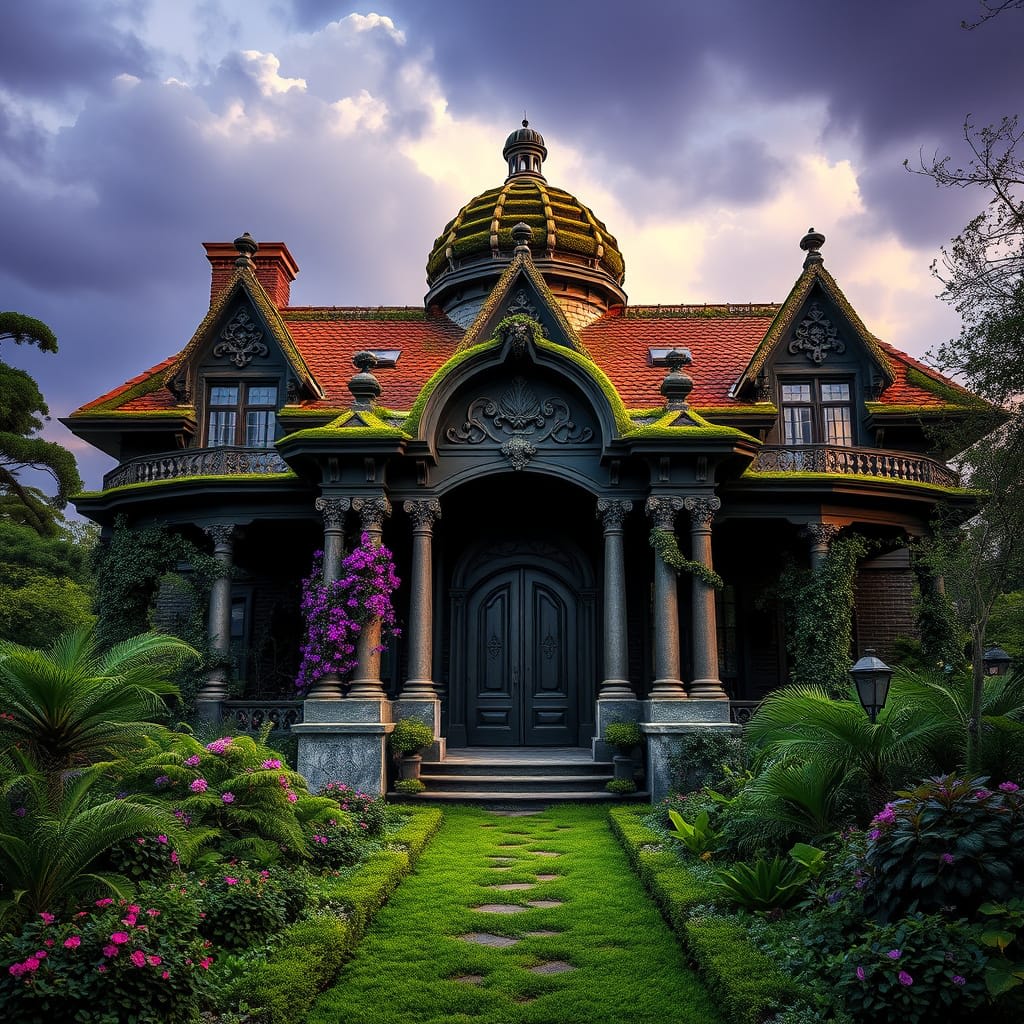 The front porch is raised and embraced by carved stone balustrades. Columns twist like tree trunks, each inscribed with symbols from lost alphabets. The door is tall, arched, and made of dark wood, it is strangely, slightly ajar...inviting.