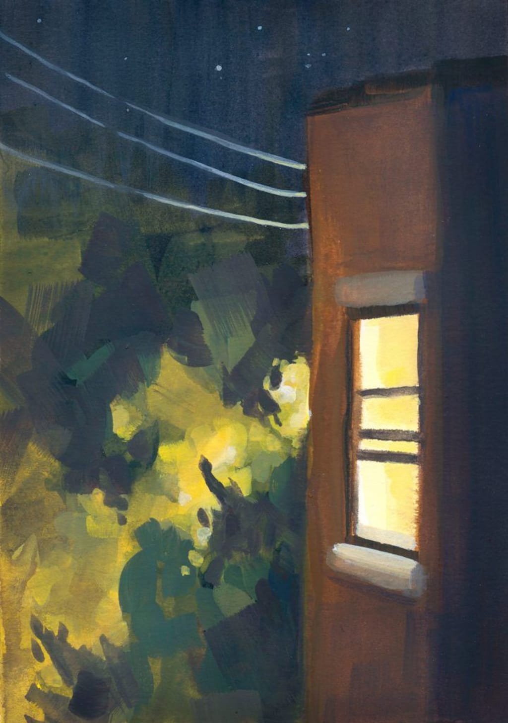 His favorite nights were these. On a Monday when everyone was home in the evenings, he could look inside at what seemed to be the whole world. The small cabin, white paint peeling into ribbons to the left, surrounded by an alcove of trees, tall pines that broke in perfect view in front of a glowing window. The owners dancing in the kitchen, how he held her close as the pot boiled over. The owl wanted to know what it might be like to hold someone during these times, their spindly fingers looking so sure of where to land. If he had hands, he wasn’t sure he’d know what to do with them.