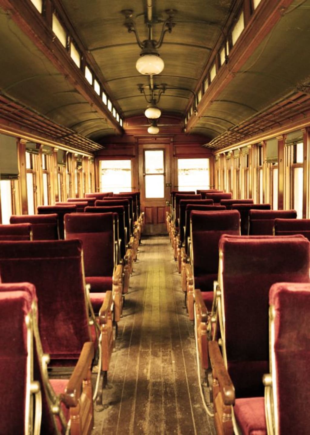 A symmetrical web of yellow lights strung with brass wires hung high above the open room. Brown vinyl walls, with brims of intricate gold lining. The circumference of the room held thick glass windows placed evenly around, they were chiseled with square layers and floral details. Loud walking echoes as hard heels strike the hard wood floor, a man makes a swift stride towards a door. Bloody footprints trailed behind him. Closing it behind him, leaving behind a young boy and a dead woman. The child stood upright, teetering, nonetheless standing on his own. The boy had on a white robe, stained with blood. The source of this mess made a path to the woman far behind him. He looked out to the door, which began to become lost in the vast array of doors surrounding him. The small boy came to realize the floor beneath him was rattling, the lights wiggled all delayed from one another, the train was moving.