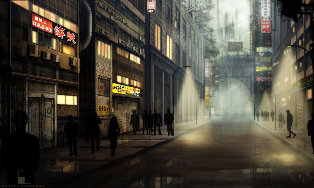 The landing area was positioned in a central location where there were multiple accessible routes through the city. Fortney had expected a large amount of the population to be here, in the heart of their thriving colony, but instead could not see a single soul down any one of the wide avenues. The ubiquitous nebula cast the cityscape in a perpetual night, making the buzzing lanterns illuminate the dark square in radiant golds and purples. A flickering sign hung askew at the gateway that read “Tridawn Circle”. There were no other signs, literal or figurative, of lifeforms present. Neither from Caelum agents or Numen natives.