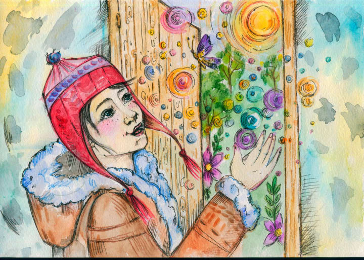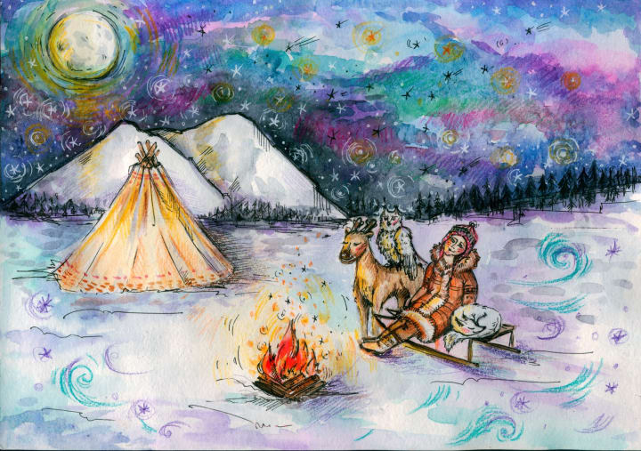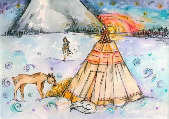 Far to the North, where the sun sleeps for much of the year, lived a little girl, Amelia. She lived with her father but he was often gone hunting over the frozen artic steppes. With no other children to play with she found herself making friends with the small animals of the Tundra: a lone baby reindeer who lost its mother, a small arctic fox, and an owl. Most of the time she was alone and she spent her time taking care of the house and using her imagination to keep her company.
