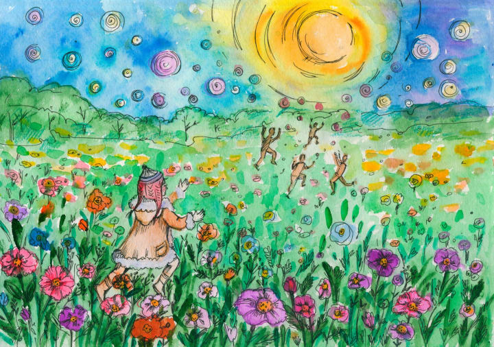 One girl, about her own age saw Amelia and came to a sudden stop, calling to the others as she did so. As Amelia waited, uncertain of what to do, the other children came running towards her calling: “Hi”, “Where did you come from?”, “How long have you been here?”, “Why haven’t we seen you before?”, “Want to come play?”. This last question was the one that Amelia had been longing to hear. All year she spent alone with her father, out on the Tundra, save for twice a year when they went to a local settlement to replenish their supplies. In all that time, she had no one to play with save her three friends, the reindeer, the fox, and the owl, and that certainly wasn’t the same as getting to play with other children! So, hearing from these children, that she didn’t know, but who seemed to be having SO MUCH fun in this warm and wonderful, secret place, she didn’t hesitate. “Yes!” she cried, “I would love to play.” With a squeal of glee two of the other children grabbed her hands and pulled her off into the meadow, laughter and shouts trailing in their wake.