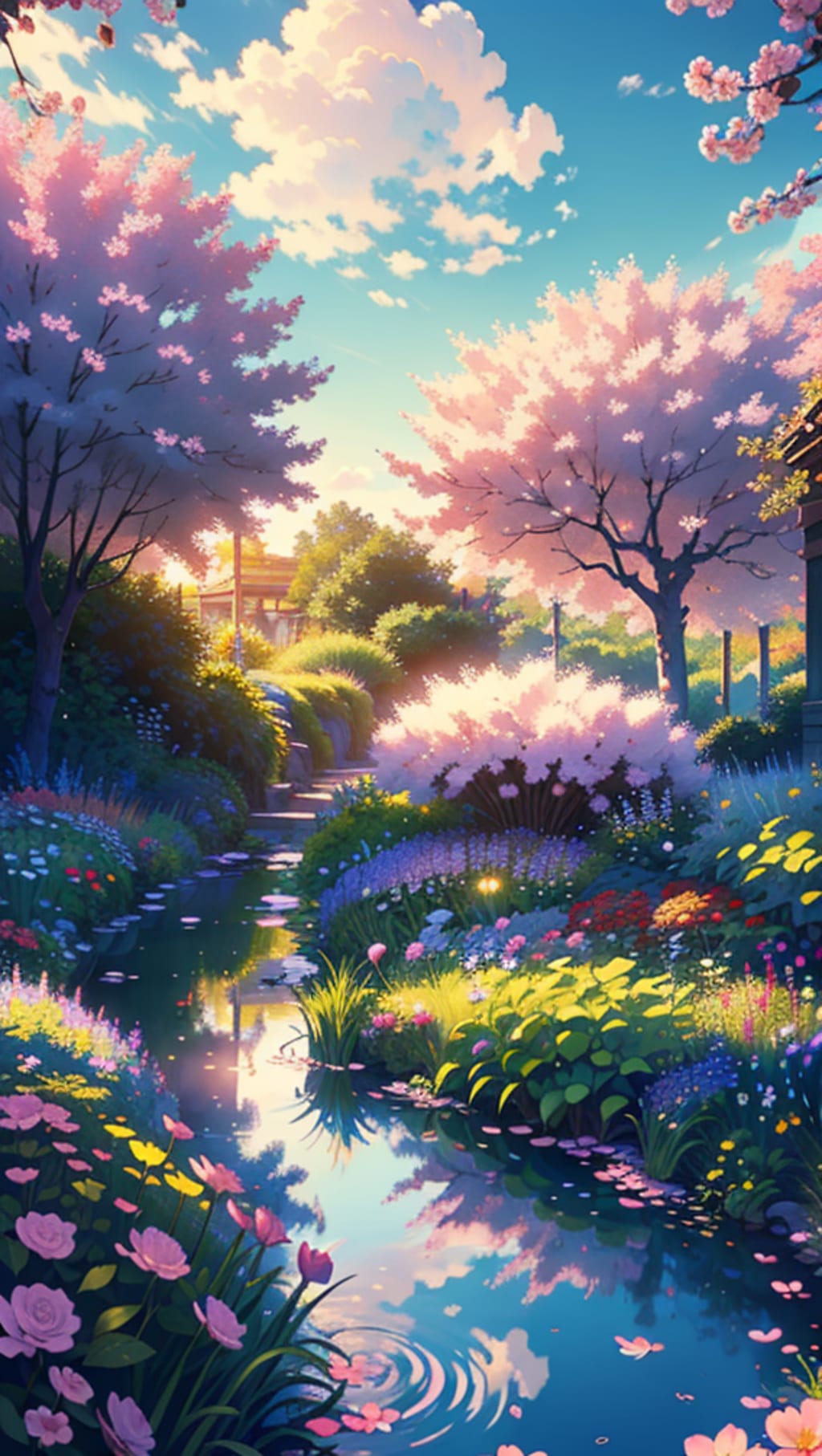 At the center of this captivating landscape, a series of attractive lakes and canals twist elegantly, each one embellished with lotus blossoms and innumerable other unknown, yet equally charming flowers. The water flickers like liquid gemstones, reflecting the azure sky above and the luxuriant greenery that surrounds them.