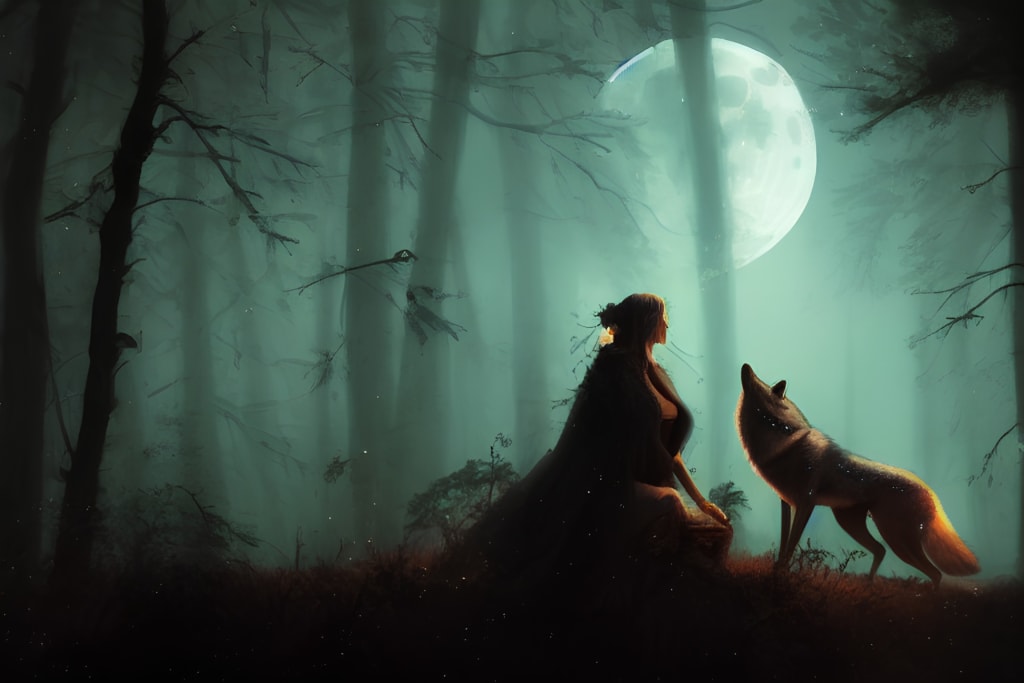 Once upon a time, in a remote forest, there lived a lone woman named Elara. She was a strong and independent woman, who lived in the forest with her beloved wolf companion, Lycan. They had been together since Elara was a child, and Lycan had been her constant companion and protector. Elara was known in the village for her uncanny ability to communicate with wolves, and her bond with Lycan was the stuff of legends.