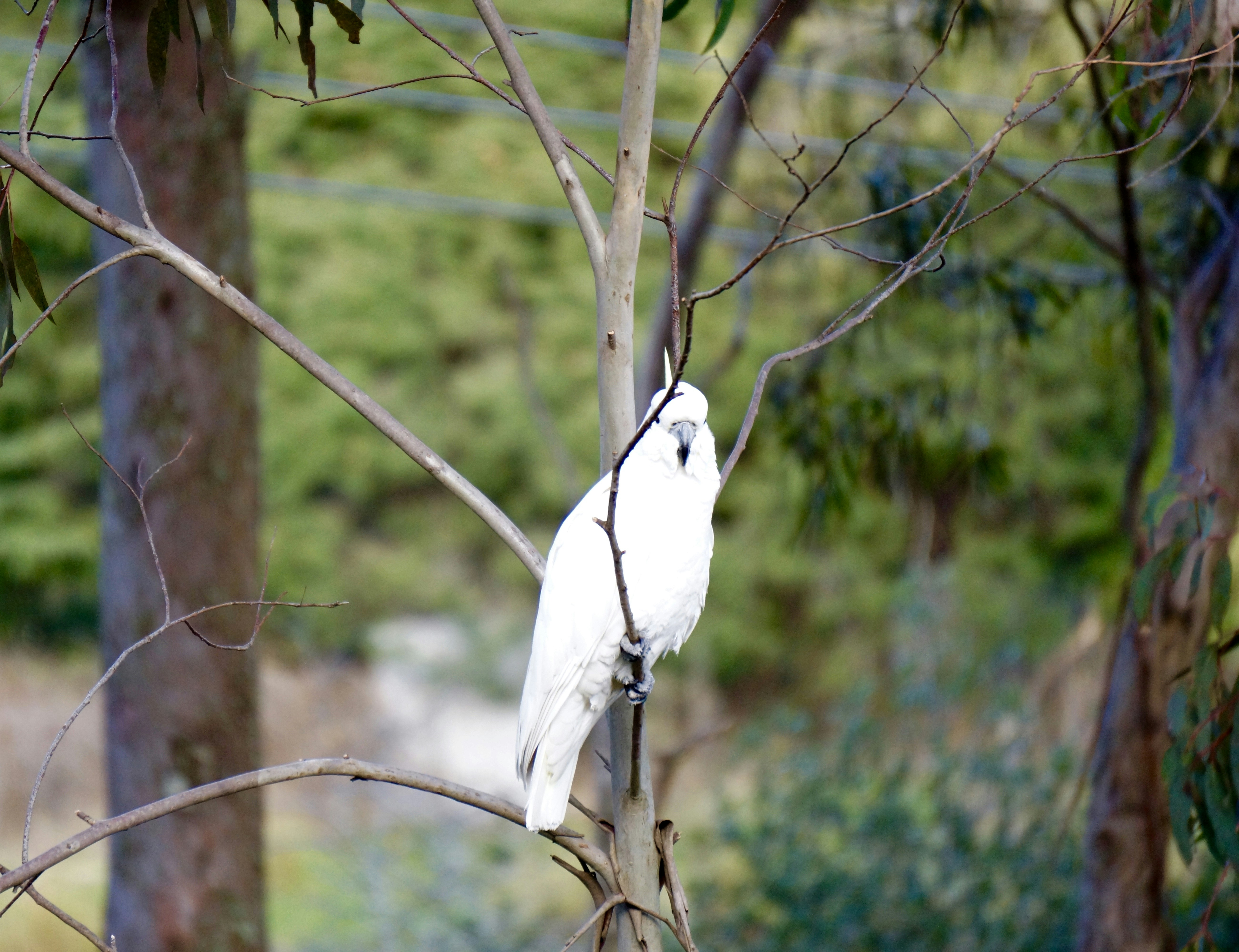 Innocence itself personified in colors of purity. The poor bird has no idea that whoever had chosen to name him this unfortunate sobriquet, had not the foggiest inclination that a naughty intention had been attached. I hope this is a picture of a Cockatoo, darned if I am sure, but it will do.
