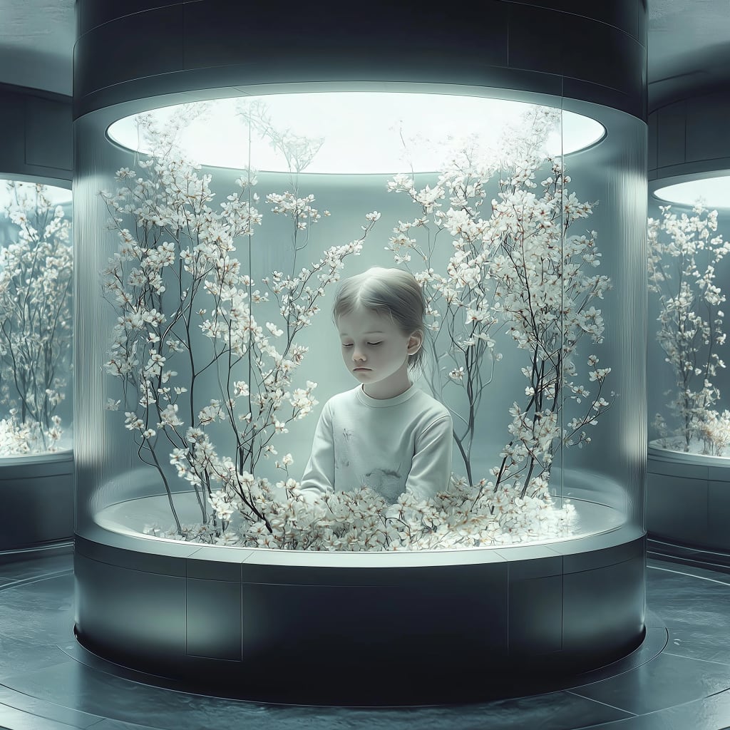 She rests in a seated position now, legs tucked, back straight. The glass curves inward around her, a transparent cocoon. Vines grow up the sides of the chamber. Decorative, maybe symbolic. I’ve watched the leaves change through three seasons. Her face never does.