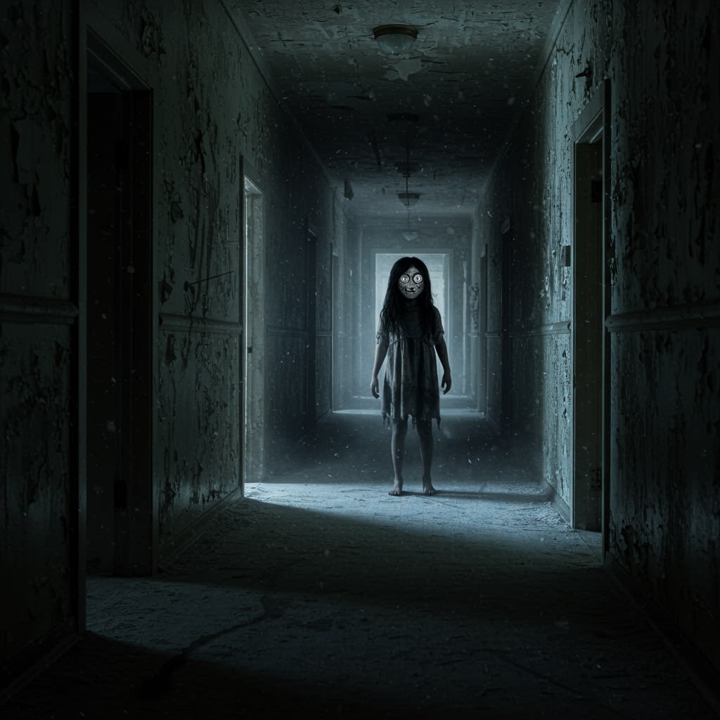 A little girl stood at the end of the hallway, half-hidden in the shadows. She wore a gray dress, torn and filthy. Her skin looked pale, almost bluish, and her hands hung limp at her sides. But it was her eyes that froze me in place.