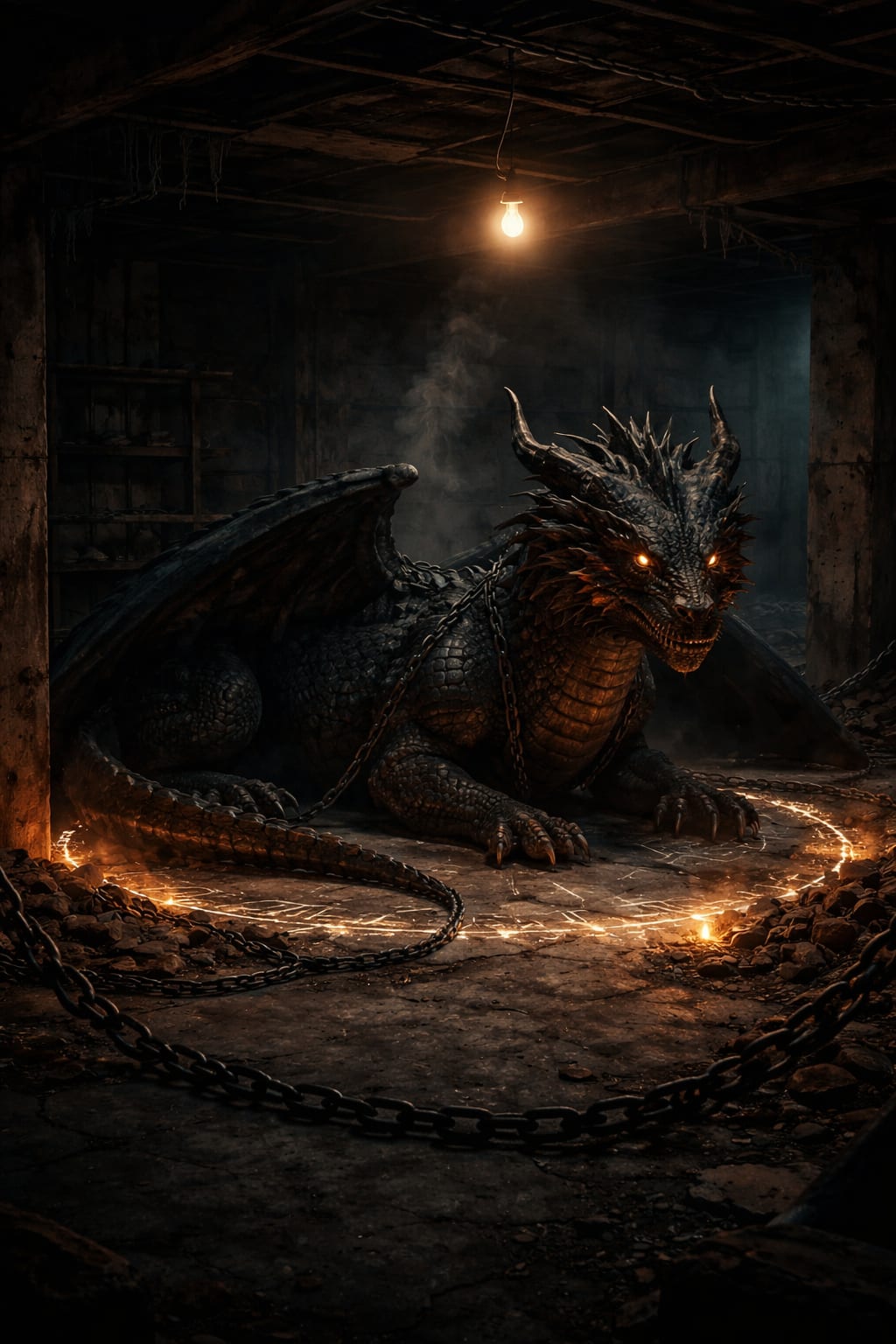The dragon’s tail twitched, chains clinking softly. The sound traveled up through the floorboards. Somewhere above, a glass rattled in the sink.