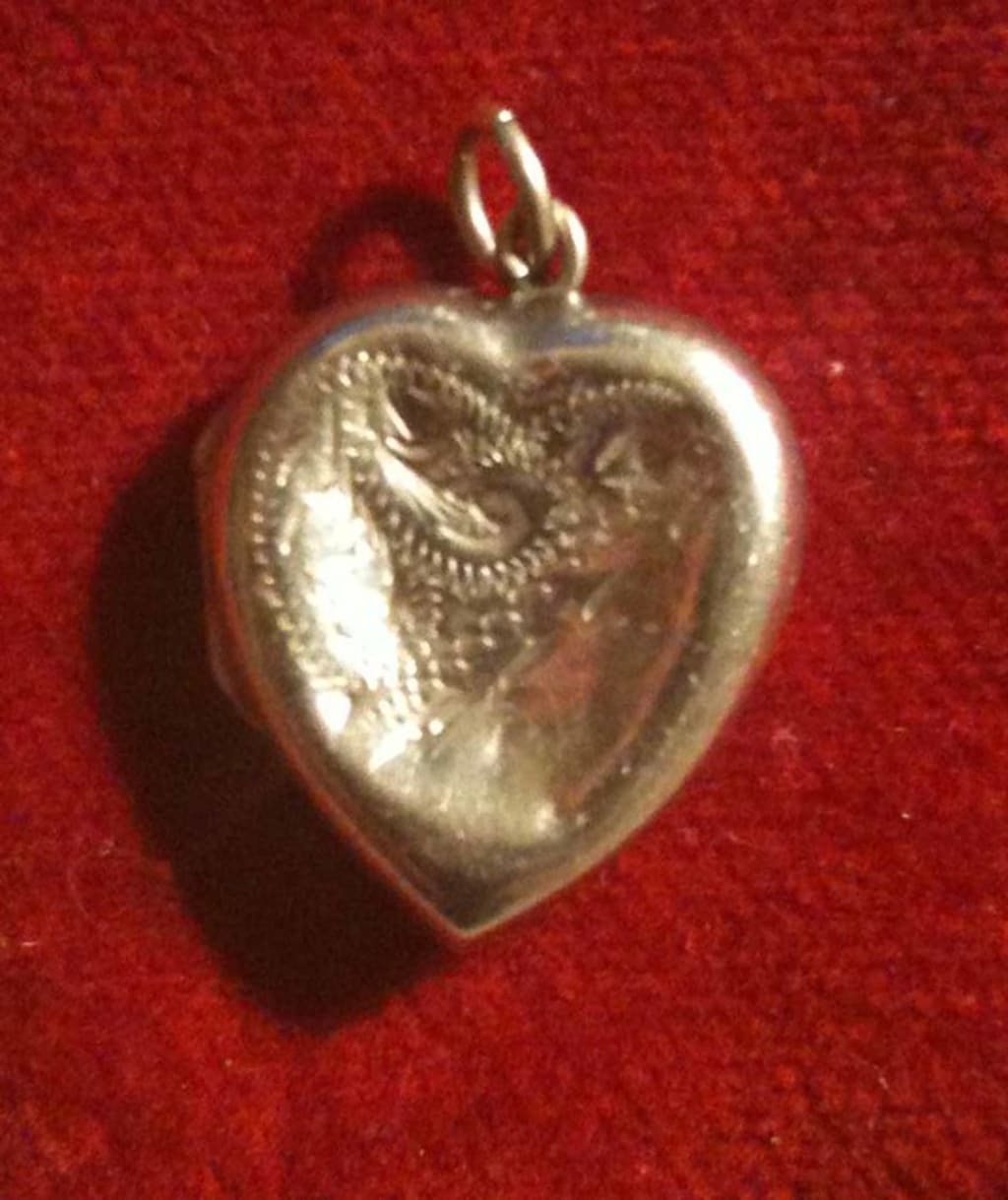 Kneeling down, he reached out and grabbed the small item. Turning it over in his palm, his eyes scrutinized all the nuisances of the small metal heart shaped locket. He rubbed his thumb over the outsides removing the dirt that clung to it in many spots. He noted the damage to the casing, spotting 3 large indents just below the clasp. Curious of what the old owner used it for, he released the clasp sending the heart open.