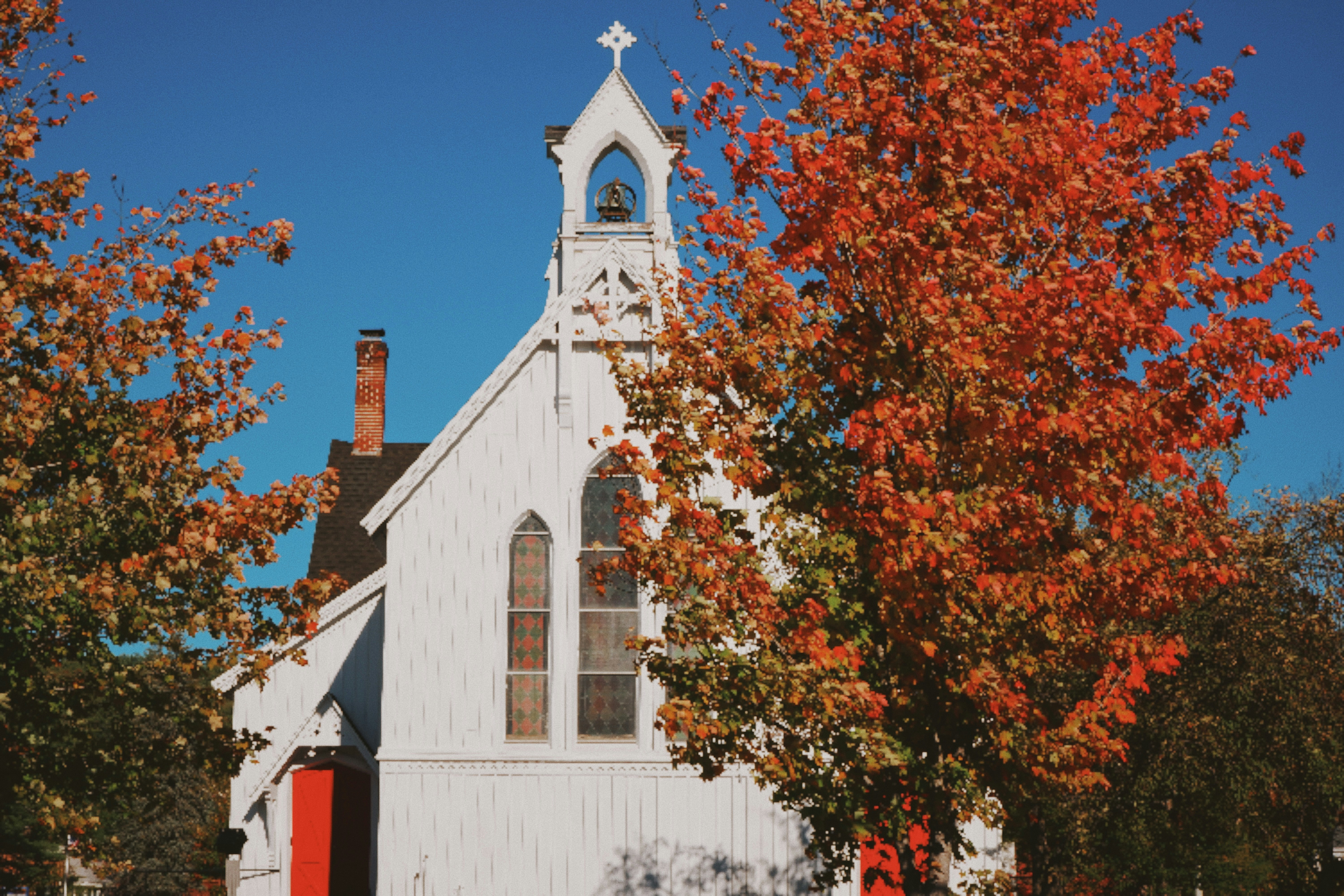 There, only a few steps from the Fire Hall, stands an old slick white octagon shaped Church with deep, dark, blue accented windows and door frames. Each of it’s eight sides contains one rectangle shaped window, with multicolored, stained glass windowpanes in each. On East facing side of Church is two windows half the size of other windows embedded within front door.