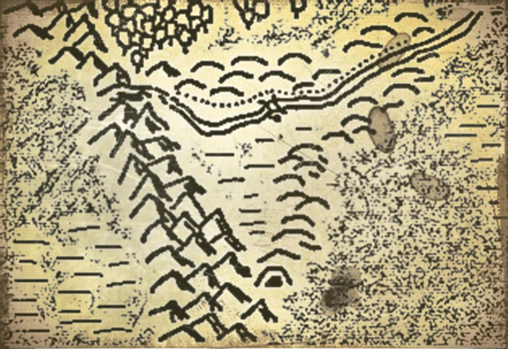 From Erberan, the pair was to travel without horses, as the terrain was steep in places, down into the valley until they reached the river-crossing at Dissidtown, and then up the other side of the gorge, into the Fireshield mountains, and their goal.