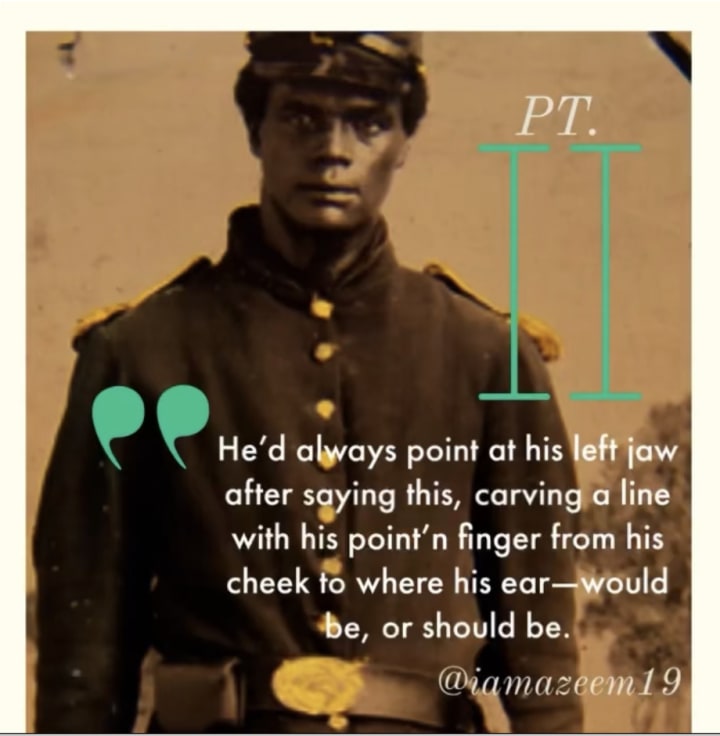 I wasn’t much of a talker. My daddy taught me before passin, “white folk don’t care for you, and they don’t want your words to be too loud.” He’d always point at his left jaw after saying this, carving a line with his point’n finger from his cheek to where his ear—-would be, or shouldda been.