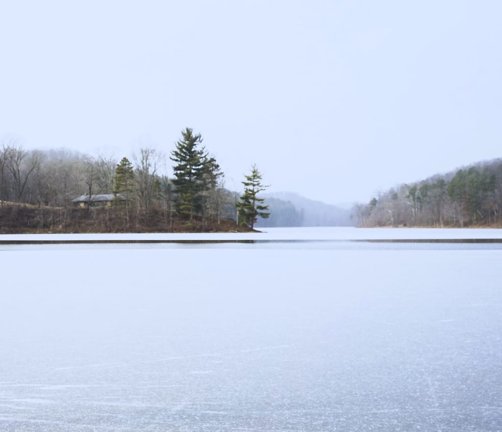 As the pair neared the snowy summit, they hunkered into low crouches. The view spread out below the hill in a huge swath of flat land and the solid bluish-white of a frozen pond. Across the pond stood the edge of a snow-covered forest that stretched toward a distant mountain. The sight that captured both boys’ attentions, though, stood in the center of the frozen water.