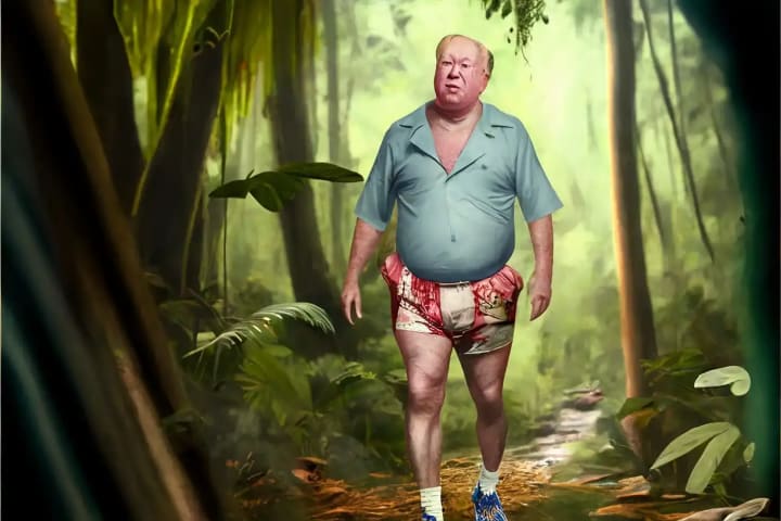 An out of shape politician walking through a jungle in his shirt and boxer shorts