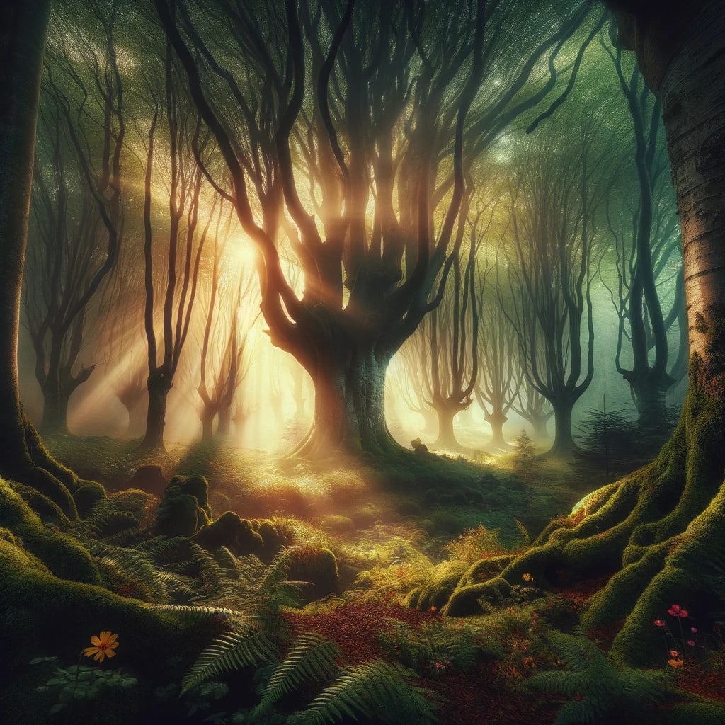 In the heart of the world, veiled from the prying eyes of civilization, sprawled the Whispering Woods - a forest so ancient, legends whispered its roots entwined with the very fabric of the universe. Each tree within its embrace was a guardian of wisdom, their canopies a tapestry of green whispers, speaking the language of the wind, water, and earth. These were not mere trees but sentient beings, the oldest of whom remembered the stars’ birth.