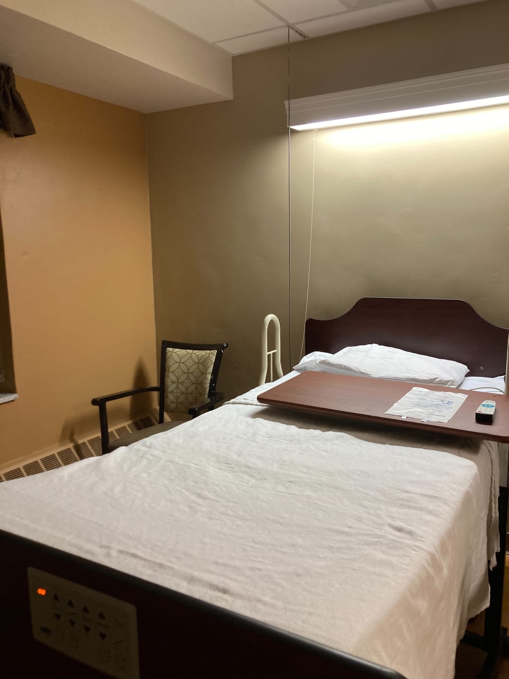 I was excited to receive my first resident. I proudly shined behind the metal bed frame that held a neatly made bed of white linens. Pushed right up against my left side a closet, empty with hangers for future use. To my right, a nightstand with a welcome packet. If you open the drawers there are all the personal hygiene necessities to begin their stay with me. The bed is pushed up against me as well and I relish these interactions. The feeling of the wardrobe and nightstand against me are like friends holding my hands and making me feel surrounded by their love imprisoned in silence with me. The closeness of the bed affords me the occasional touch of a human hand or knee when they have rolled too close to the side of the bed that is parallel to me or if they are able to hang photos or personal items on me. I hear and see so much but touch is the rarest of the sensations ever fulfilled. Not just for me, but for my friend in the bed before me. So many times the occupant of the bed lives out the rest of their days in lonely isolation, forgotten by family and left behind by friends that have passed before them.