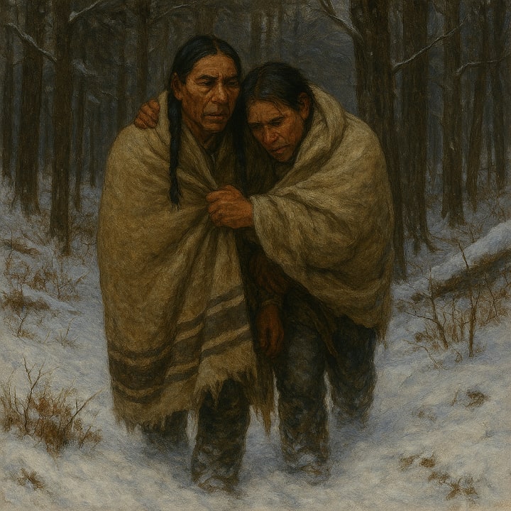 Silver Cloud now regretted having dropped his blanket - but his brother's hung on a nearby tree. It was frozen, cold - he shook it vigorously, icy bits falling everywhere - it would still help with warmth. Together they struggled back to his lodge.