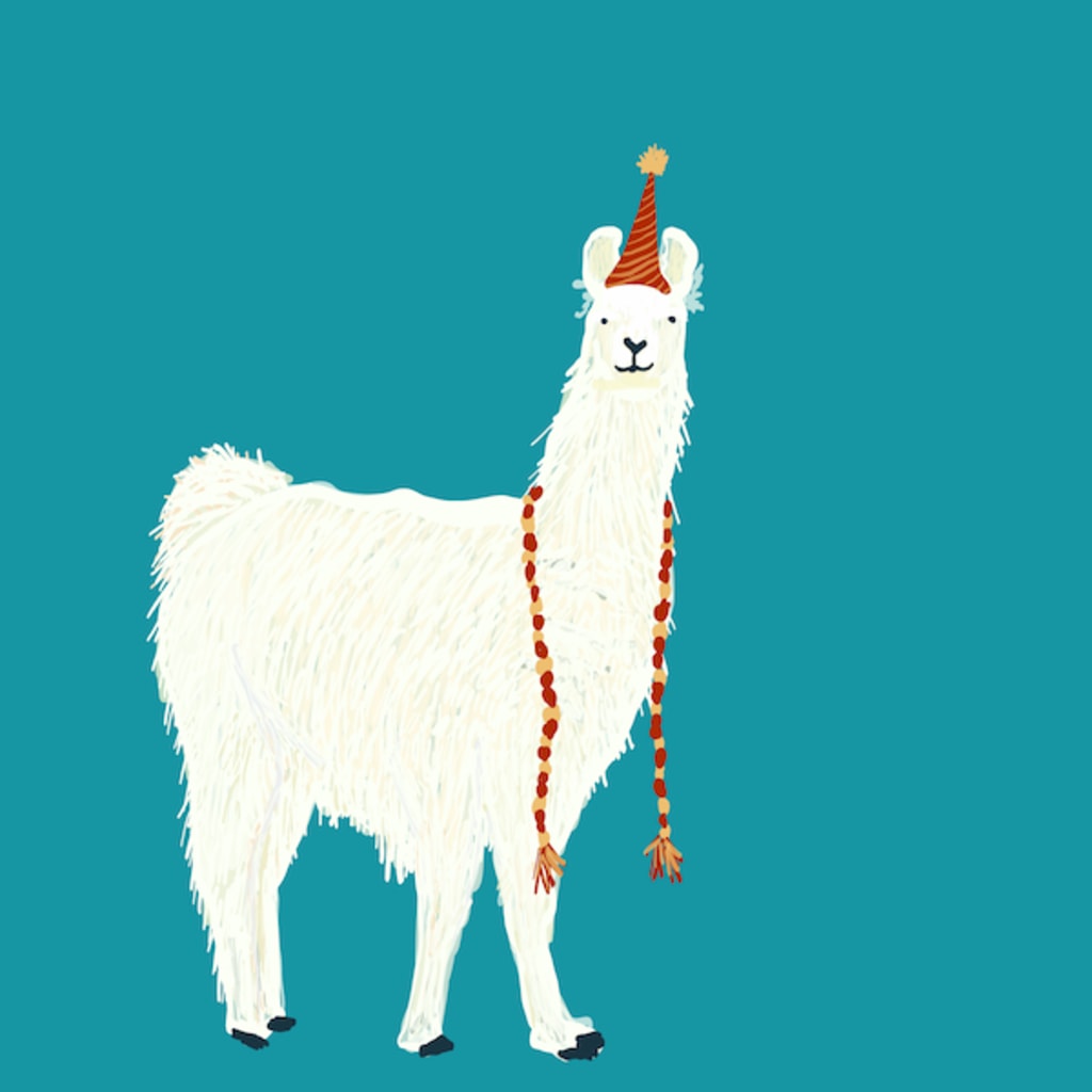 Linda was ready to leave again. Looking out across the pasture, she counts her llamas, “One, two, three, four… oh my, what is on their heads?” She heads down to the pasture and sees Liam racing over to greet her. On his head is a colorful party hat with soft festive pom poms. Linda hugs Liam and, through laughter, says, “How did you get those hats?”
