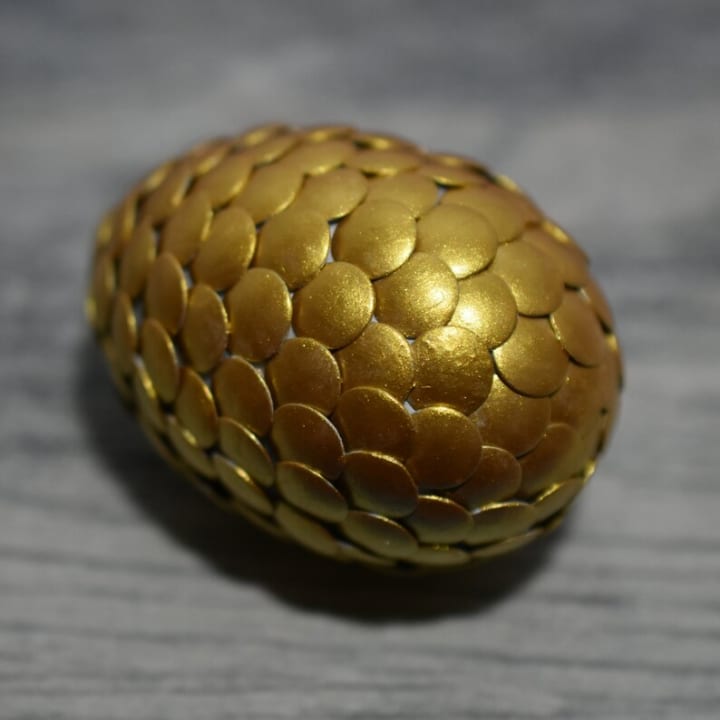 Tanwen, the great golden dragon, walked the countryside on a cold winter night. As she walked, she breathed in the winter air, the moonlight made her scales glitter. She had just said goodbye to her resent hatchling's and breathed out and melted the snow on the trail; the moonlight revealed a child in dirty rags frozen under the snow. A little girl no more than two years old, with a lovely face and red hair that looked like fire. She was thin and covered in bruises. She nudged the child with her nose, but she did not move. Tears started to run down her face thinking who would leave a child in the middle of the woods to die. Her tears landed on the child, her body turned pink, and she heard a faint heartbeat. She wanted to save this little girl and she wrapped up the child in her tongue and swallowed her whole, then went back to the cave in the sapphire mountain. She went to sleep that night, and her belly started to glow. She woke up the next day with her belly swollen, and then she positioned herself over her hoard made up of gold coins and jewels for hours, and with great pain, she forced out a giant gold egg. She laid by the egg for five days until it started to glow and crack. The egg hatched, and the child emerged alive, she looked healthy, and her bruises were gone. Tanwen transformed into a tall, beautiful woman with golden hair that flowed down her back and touched the floor and porcelain skin that was soft as silk with gold eyes that were warm as the sun. The girl looked up and reached out to her, she picked up the child, and held her close.