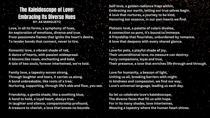 Love, in all its forms, is a kaleidoscope of emotions, each hue painting a unique expression of affection and connection. From passionate romance to steadfast companionship, familial bonds to self-love, love weaves a tapestry of experiences that enrich the human spirit. In this exploration of love's diverse shades, we delve into the myriad ways in which love manifests itself and touches our lives.