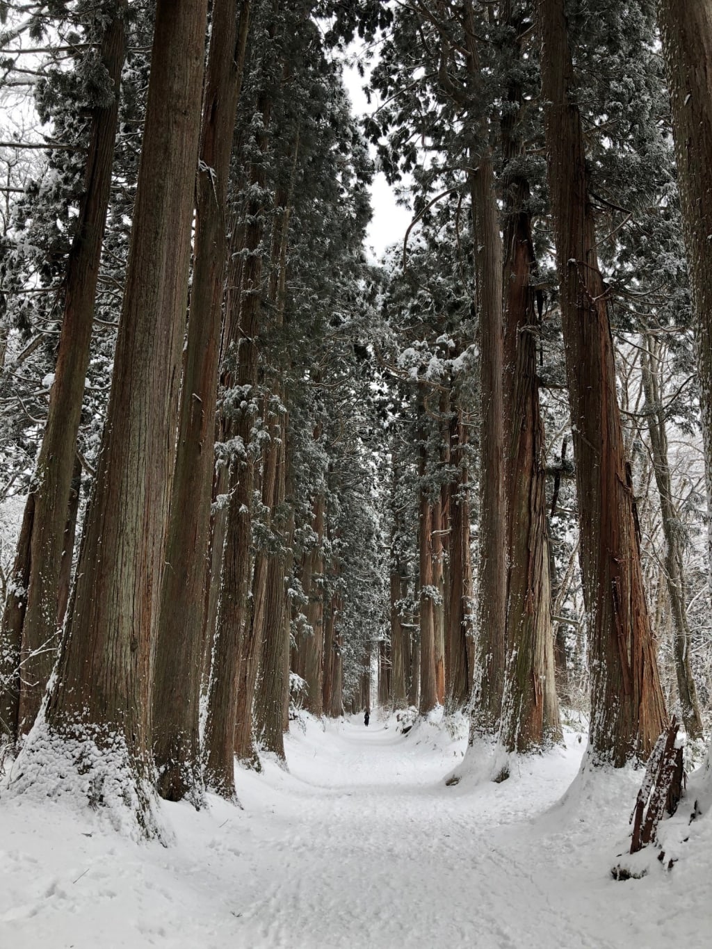 With a belly full of warm noodles, the trek to the cedar forest did not seem as long nor as arduous as it had appeared on the map. Still, it was no walk in the park. It was still snowing lightly and the path was not well-travelled, so my feet crunched in the thick snow every step of the way. By the time I reached the forest itself, I had grown warm from exertion and my breath was very visible as I panted along the hiking path.