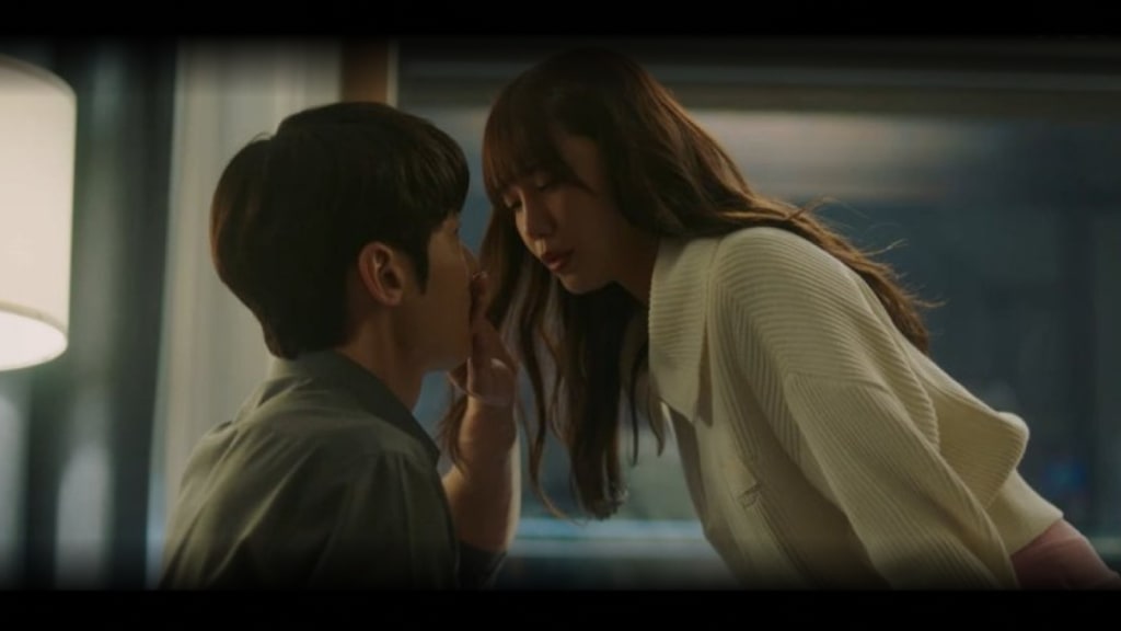 - Mi-jin leans in for a kiss, but Ji-ung blocks it with his hand, assuming she is about to bump her head against his.