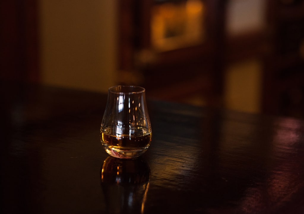 Keeping his head down, he picked up his glass of whisky, almost empty but still filled enough to have a reflection. As he raised the glass to his mouth, he looked in the reflection to get a clear view of the room, just barely catching a flash of movement coming from behind him.
