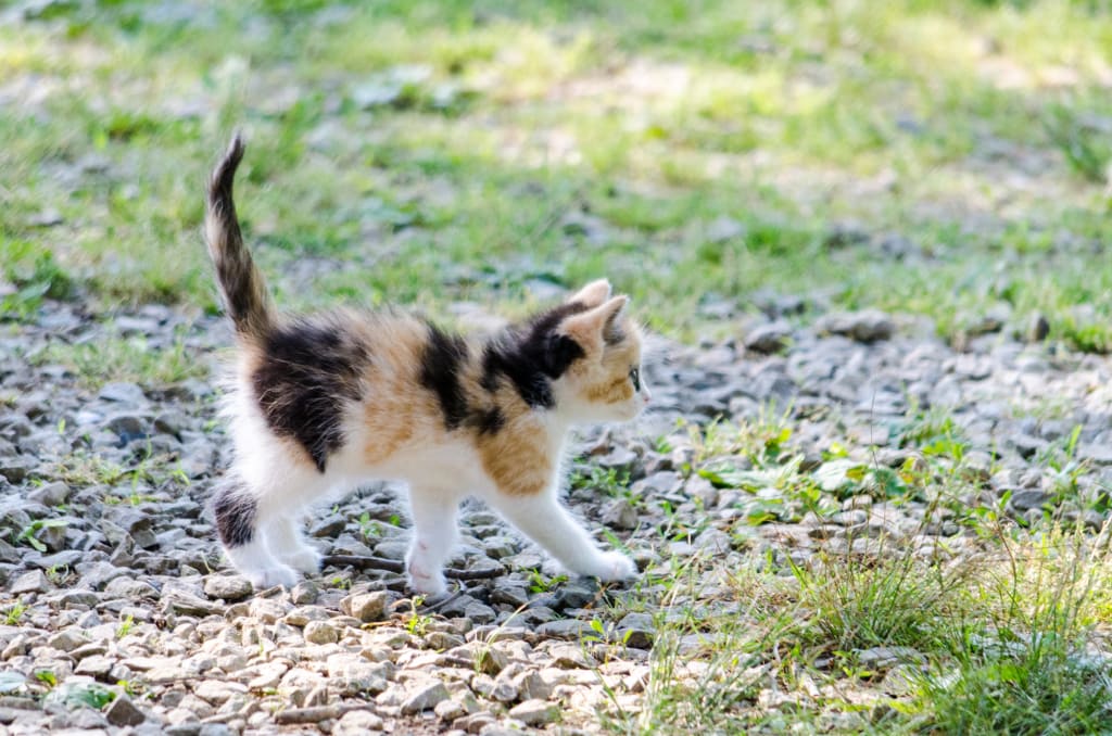 Finally, one of the kittens noticed her. He was multicolored–orange, black, and white with white socks and a black mask around his eyes.