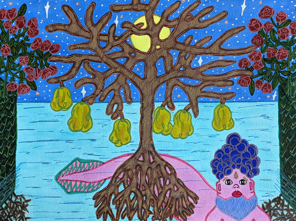 Six sapling-bred pears were attached and just as prodigious as the overall spectacle of its branches and base. The pomes were so engorged they looked disfigured, although so plump and succulent with the exterior shade of chartreuse, making it appear enjoyably sweet altogether with its thickness. Pendulous on the nethermost branches. As I went along the shoreline, stepping in noisily, daring to grab hold of one fruit, an adumbral presence rose up from the water and the upper body surfaced absolutely bold. Before I could even take a step into the tide, the creature's features shone in the moonlight, with the embodied state of an undersea aquatic life figure, resembling a Hindu Goddess's aspect. She sailed stern in front of the miraculous bark illuminated in the dark, ready to pounce. She was the Empress Goddess Shimba Shumba Slambala, keeper of the six lowly hanging fruits, the unworldly pears attached to the young tree. That very moment when she prepared to confront me, a strike of a magnificent magnitude— a Lightning Bolt of impeccable ferocity, brought her down before she could even slither over to stand a trial against me. Right there I became the sequence breaker of the ominous forces holding back my undeniable dreams and futility; gone in an instance.