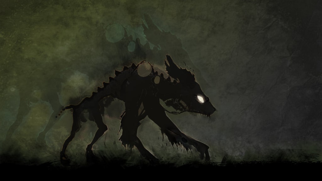 Her onslaught continued until the beast lunged at her from the shadows, unveiling its gruesome form: a nine-foot-tall black mass of horrid tendrils forming the shape of a scorned hound with a grisly misconfigured mouth full of serrated teeth. An abominable sight indeed.
