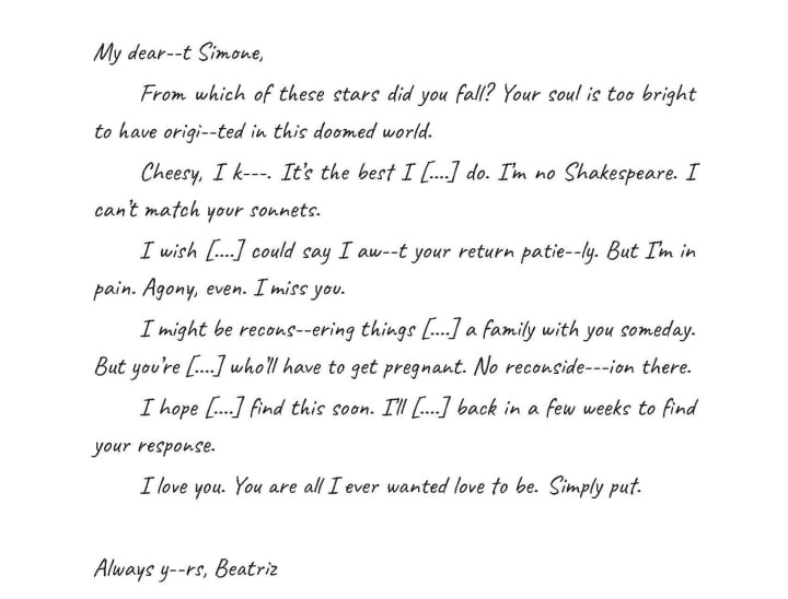 ----- I suddenly wonder about this heart-locket. The lost letter that will die with me, around my neck. Simone and Beatriz. What happened to them? Were they Citizens? I have never heard of a unit with two women.