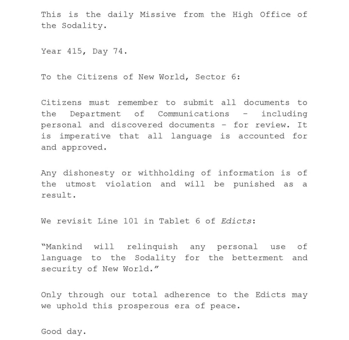 15 THE COURT: We understand, Citizen. That may be, but it is not the mistake that offends the Sodality. You have proven yourself to be a dangerous individual; you have the potential to disseminate, to create and share language in secrecy that might threaten New World. Or have you forgotten the lessons taught from the Edicts of New World? The Sodality prides itself on its history of providing a beacon of hope and structure. We do not tolerate dissenters. You seem sound enough to recognize that.