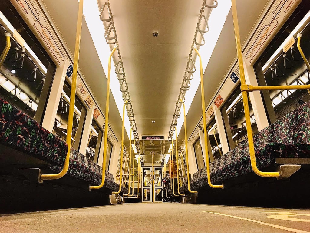 Just then, the city train full of 5pm commuters comes hurtling past. I notice the men and women in suits gathered together at the windows looking at us, shocked expressions on their faces. I recognise the man in the suit and the blonde woman from the first day I saw the dead body. The man in the suit points authoritatively towards us with one hand, and the blonde woman takes his other hand in hers. I wonder what they are thinking, what the people are saying. I see a flash of a camera and wonder who it is taking a photo of me and the alive-dead man. I imagine that it’s the reporter who wrote the story in today’s paper. It all seems to happen in slow motion, like a scene from a movie or an early morning dream, the confused stares, the unheard conversations, the excited voyeurism or casual disinterest. All this is captured in a split second of time, a memory's snapshot, as the train surges on into the night.