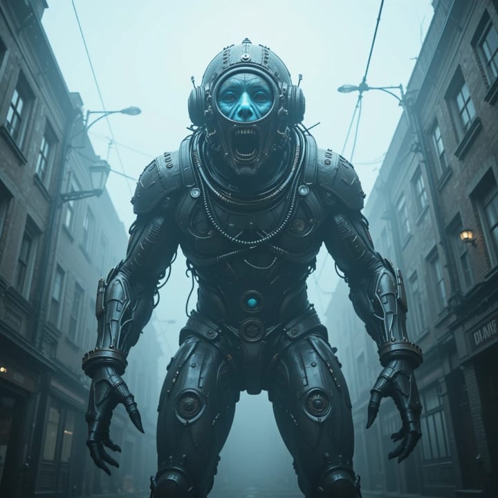 A new figure, a silhouette of a man, tall and gaunt, appeared in the fog. It was not a drowned. It was a man from the sea. A victim. A king. He was wearing a rusted, archaic diving suit, a grotesque parody of a human. His face, a distorted, screaming mask of despair, was trapped behind a single, glass lens.