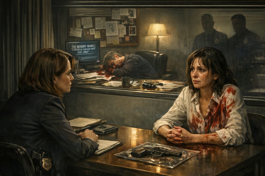 Margaret sat across from me, shaking. His blood was on her blouse. She looked straight at me when she spoke.